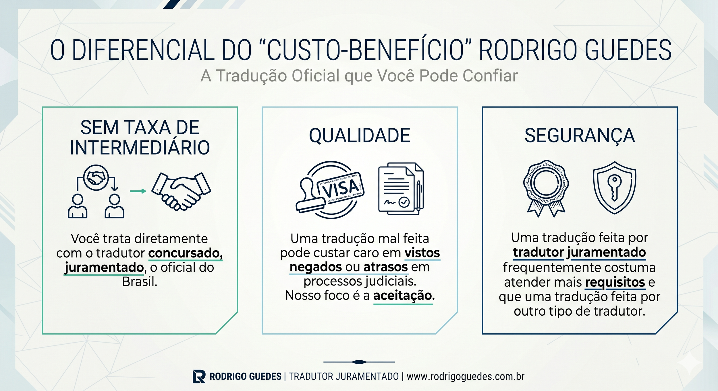 Rapidez, pontualidade e qualidade atestadas pelos próprios clientes nas avaliações do Google ao enviarem os trabalhos. Rodrigo Guedes é tradutor juramentado há mais de 15 anos e vem ajudando intercambistas e imigrantes a conquistar seus objetivos no exterior e no Brasil, bem como empresas com presença nacional e internacional.